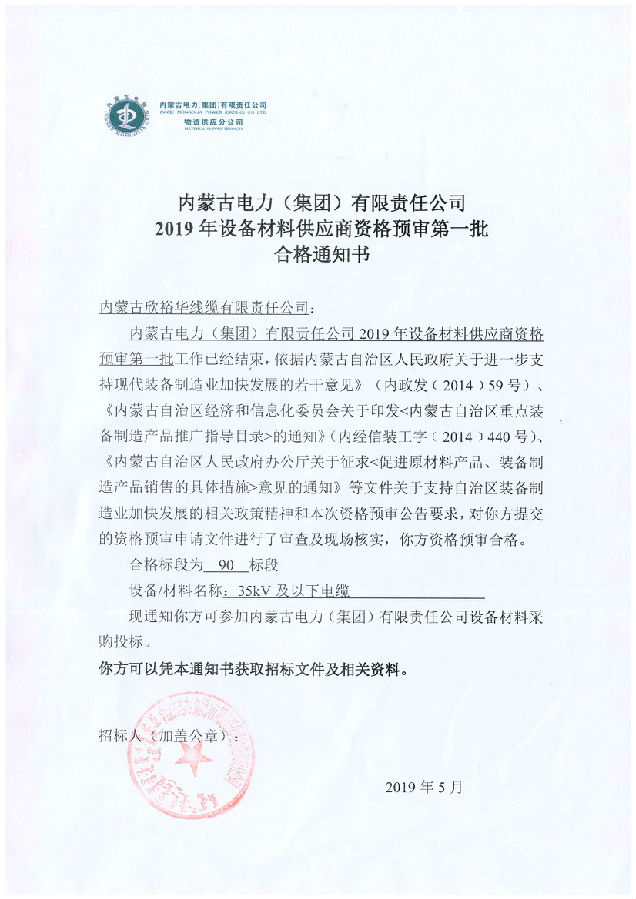 內蒙古電力(集團)材料供應商資格預審合格通知書